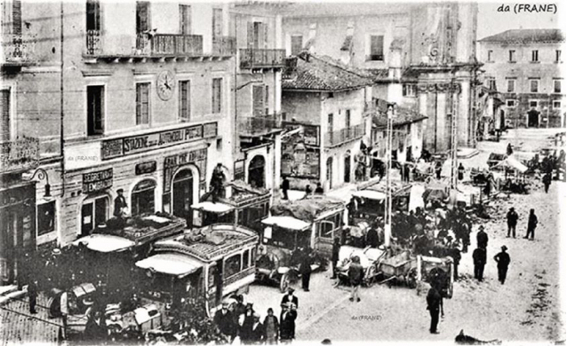 Gettata l’acqua sporca nel tombino, metteva i soliti abiti sdruciti e sopra d’essi uno spolverino grigio da lavoro, calzava una coppola di sghembo e, freneticamente ancheggiando in passi brevi, si portava in Piazza, dove i postali scaldavano già il motore. Spasimante faceva il facchino, un mestiere povero ma sicuro, a quei tempi, quando i bagagli non entravano in corriera ma finivano tutti sul tetto della vettura, trattenuti da lunghe barre perimetrali alle quali venivano assicurati con un intreccio sapiente di corde. La stazione delle poche corriere stava allora, striminzita e caotica, dal lato delle Anime Sante, la Chiesa sorta a memoria dell’apocalittico terremoto del 1703, a fianco del palazzo merlato, dal cui terrazzo veniva chiamata la tombola durante le ricorrenze patronali.